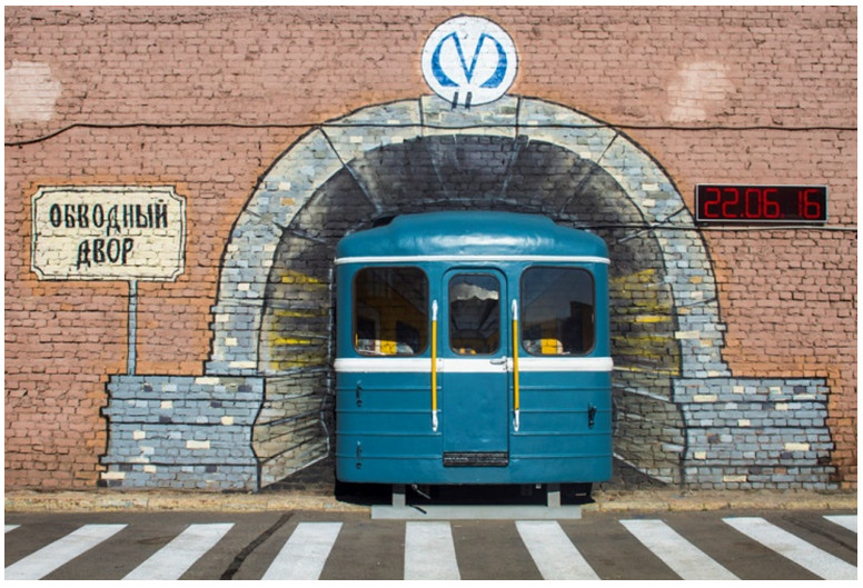 /Июль, 2016/ В деловом центре "Обводный двор" - проект компании "Охта Групп", - расположенном на набережной Обводного канала, 199-201, установлена инсталляция, посвященная 60-летию Петербургского метрополитена. Арт-объект представляет собой скрывающейся в туннеле вагон метро.