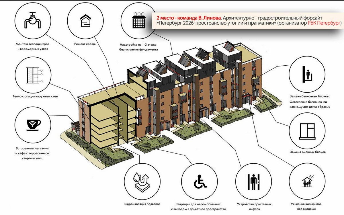 Второе место заняла команда Владимира Линова, которая представила проект преображения панельной застройки в Невском районе - "Старый, добрый, новый". Этот проект эксперты сочли наиболее реальным в перспективе 10 лет. Привнести загородный образ жизни в городскую среду авторы считают возможным именно в панельной застройке города. По мнениям урбанистов, апгрейд "панели" сможет стать достойной альтернативой реновации. Проектировщики предлагают освободить первые этажи "хрущевок" под социальные функции, надстроить этажи и мансарды на кровлях зданий, а во дворах развить тему сада. Фундаменты панельных домов как раз рассчитаны на дополнительные нагрузки, а прилегающие территории с советских времен превращаются в сады. Кроме того, в проекте есть теплицы для частного земледелия, спортивные и детские площадки. Авторы не обошли стороной и социальную часть квартала - здесь спроектирована школа для слабовидящих детей. Чего в таких кварталах будущего точно не будет, так это бетонных заборов, которые годами скрывали мрачные производства даже от глаз местных жителей.