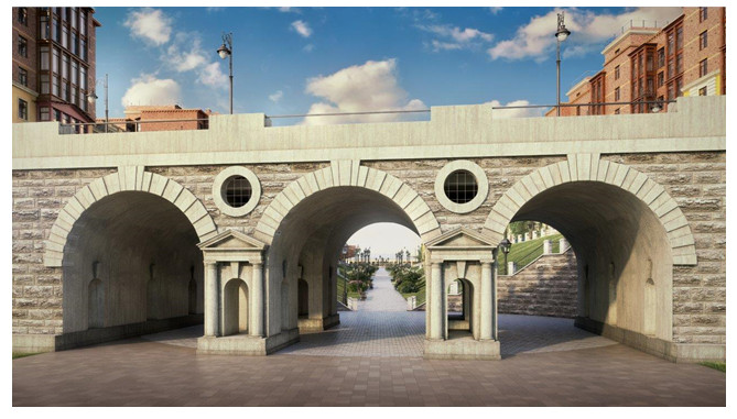 Еще одним курортным пространством станет зеленый бульвар, вдоль которого расположены дома-кварталы с безопасными, закрытыми от машин дворами. На первых этажах домов, выходящих на бульвар, расположатся торговые галереи с небольшими магазинами, ресторанами и фирмами по оказанию бытовых услуг. Вдоль всего бульвара будет устроена коллективный сад, в котором при содействии опытного садовника любой житель жилого комплекс сможет высаживать цветы на своей собственной клумбе. В конце бульвара появляется торжественный выход через три парадные арки в пляжную зону озера и живописных видов на луга.